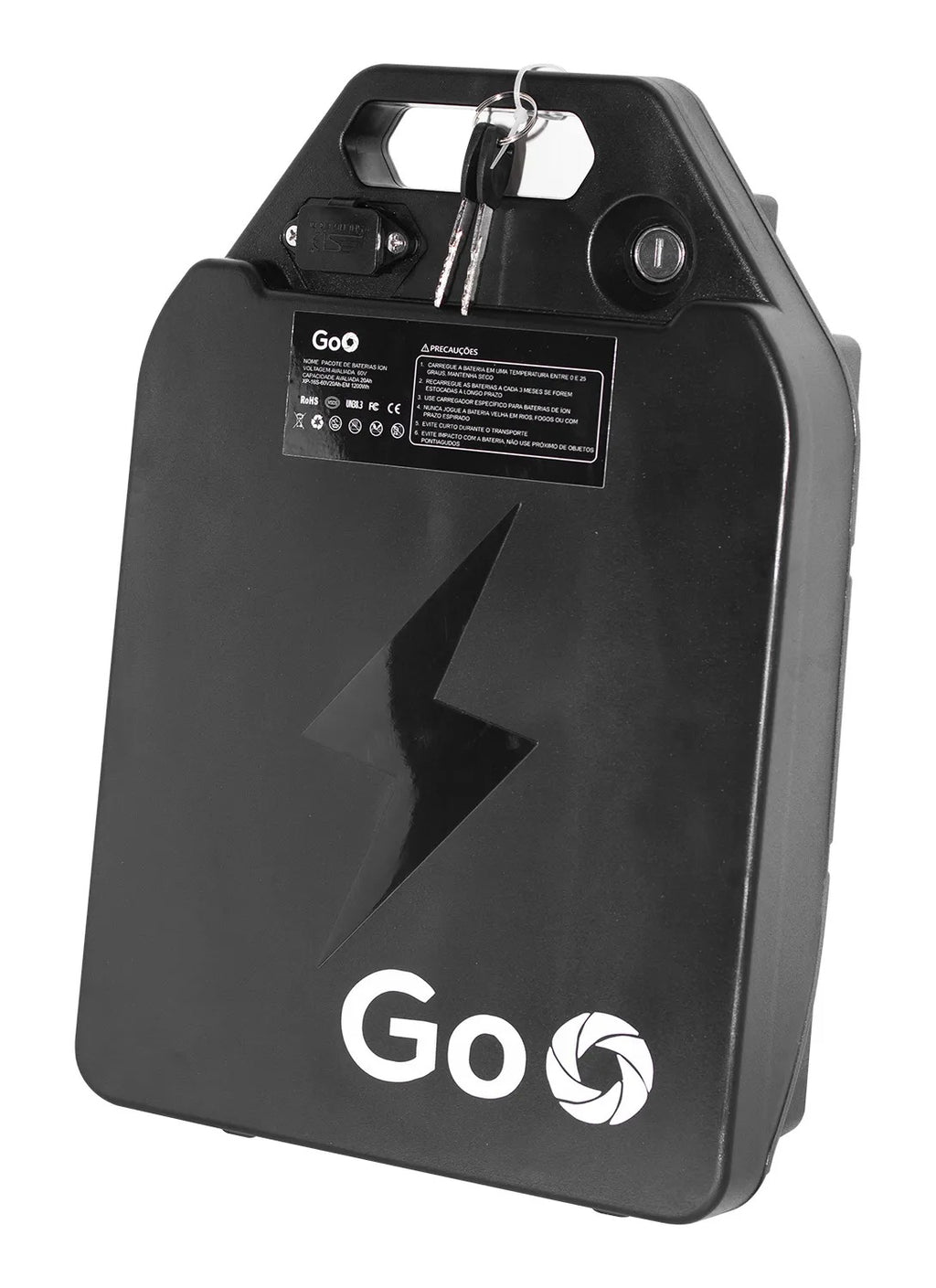 A bateria utilizada é de Lítio 20AH 60Volts, que possui muitas vantagens se comparado as baterias de chumbo ácido utilizadas pelos concorrentes, possui compartimento para bateria extra podendo acrescentar mais uma bateria aumentando a autonomia de seu produto.
